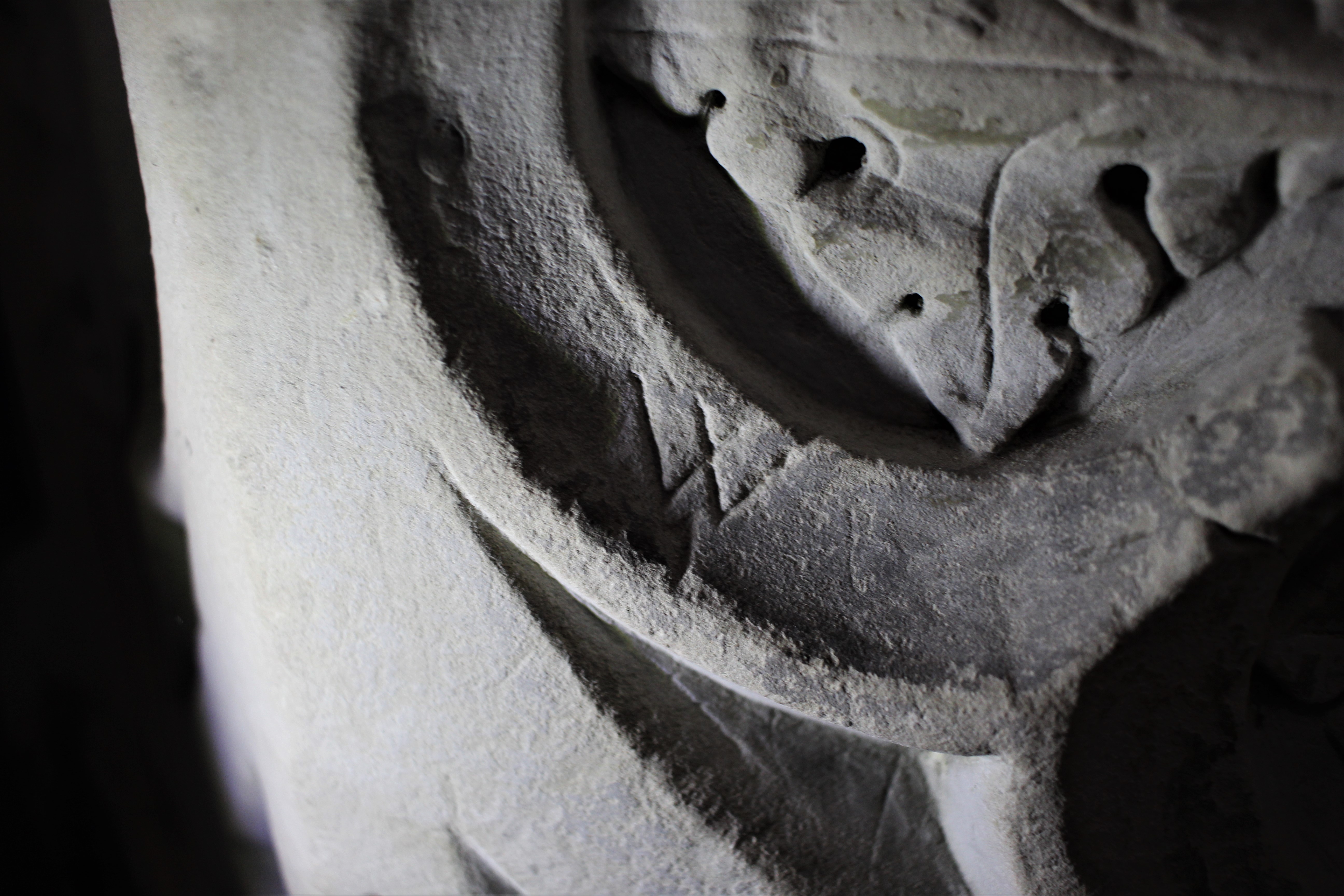 A tiny (about 11 millimetres across) Marian Mark composed of two conjoined ‘V’s on the 15th century font of the Assumption of the Blessed Virgin Mary, North Marston, Buckinghamshire. It is often the small details that lend weight to current interpretations of historic graffiti assemblages. The font has many Marian Marks (both in the W and M forms), sacred monograms, ‘dot’ patterns (arranged in threes) and saltires (‘X’) cut into the carved clunch structure. The font, of course, contained the holy water for baptism-a substance considered so sacred that it could only be disposed of in a specially-built wall piscena which ensured that the miraculous liquid did not fall into the wrong hands. The graffiti survey at North Marston is brand new piece of research by the author intended to shed further light on the cult of the folk-saint John Shorn and his holy well. https://www.treadwells-london.com/…/conjuring-the-devil…