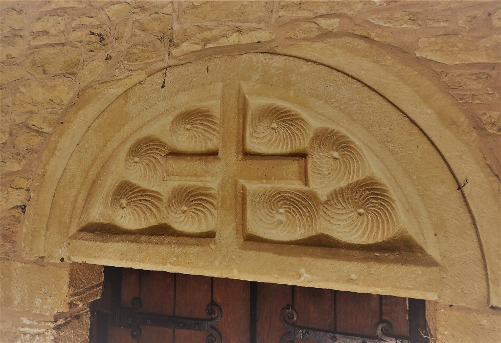 At the centre of the pedimental carving is a cross with arms of equal length; but it is the eight mysterious ‘swirling’ designs – ordered four either side of the cross – that have evaded both accurate description and definitive interpretation. As part of the inventory for the Victoria County History, Page & Willis-Bund (1924) listed the design as, ‘a plain cross and four whorls on each side’ – a somewhat perfunctory description.