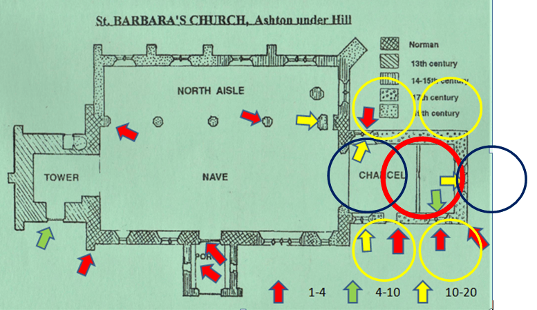 The most highly-charged ‘power centres’ within a medieval church can be described as a series of interconnected ‘spheres of influence,’ with the most desirable location for burials being the Sanctuary. The ‘holiest’ area was around the high altar with the ‘zones of sanctity’ lessening towards the Nave and west end although the tower crossing was often favoured. It appears that age-old superstitions about the burial ground north of the church – believed to be always shrouded in shadow and reserved for the un-baptised- retained its aura of undesirability up to the 19th century. All holy areas were duly enclosed within the boundary of the cemetery wall to demarcate ‘consecrated’ ground (Daniell 1997). This created a tripartite division of cemetery, church and chancel with the altar at the centre, blessed with five crosses to represent the five wounds of Christ (Plate 13).