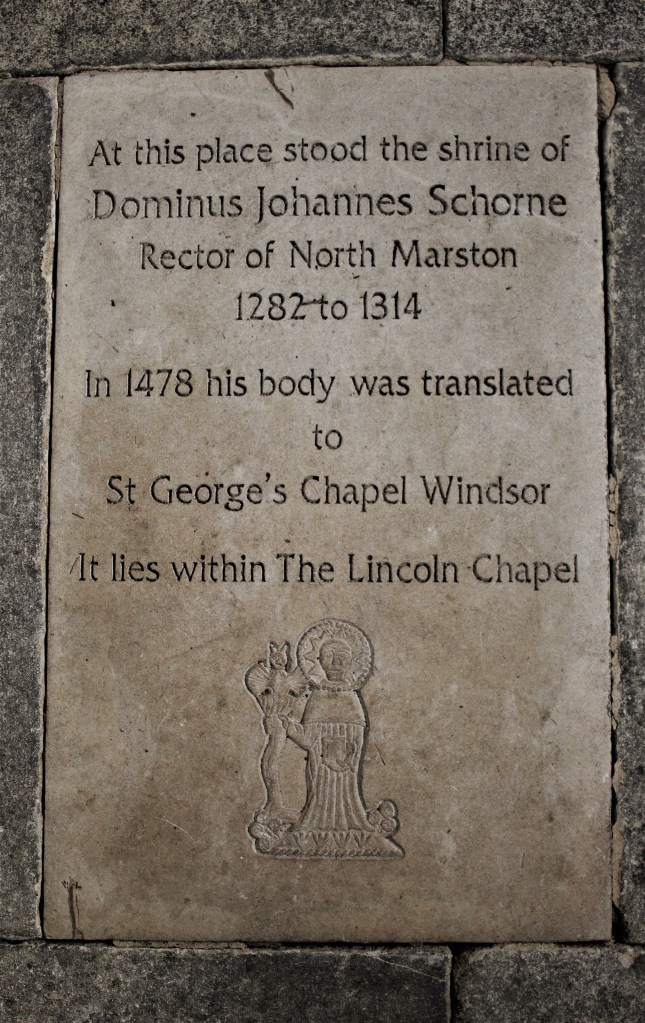 Marks, R (2002) ‘A Late Medieval Pilgrimage Cult: Master John Schorn of North Marston & Windsor’ in, Windsor, Medieval Archaeology & Architecture of the Thames Valley, Keen, L & Scarfe, E (Eds). British Archaeological Association Conference Transactions XXV.