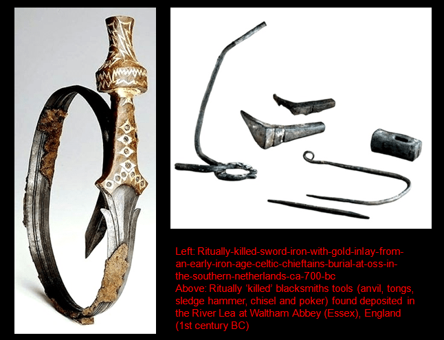 In an attempt to understand and explain the burn marks he found, Hoggard has ventured a metaphysical hypothesis based upon his own experiences. It ran along the lines of a variation on the historic practice, known as the ‘ritually killing’ or ritual death’ of an object. Such practices are well attested in the prehistoric record; the intentional smashing of ceramics, and the deposition of high-status metal objects into watery locales are a common feature of ‘sacred’ sites. For example, the discovery of intentionally bent swords is now understood to have been an act done with the intention of putting the object out of service in this world and so to ‘transform’ it for use in the next otherworld / underworld. During excavations in London of buildings dating to the 16th-17th century Ralph Merrifield had similarly begun to notice that some deposits contained objects which appeared to have been intentionally broken prior to deposition. This practice is also acknowledged as a component of spiritual midden formation, as all the objects seem to have been patched, soiled and in some instances, intentionally broken.