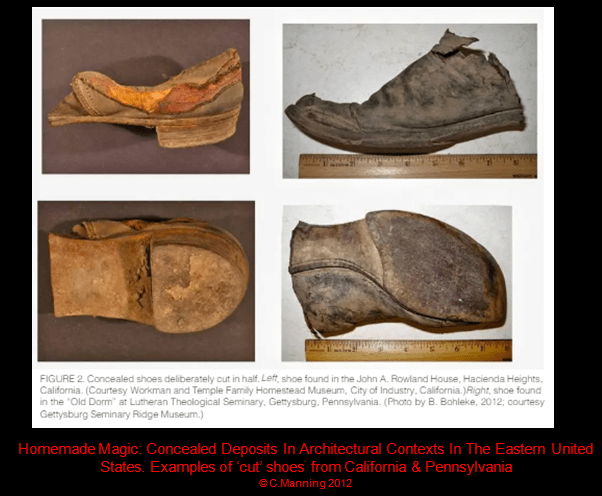 Merrifield had noticed that many of these deposits in post-medieval buildings were located close to, or marked upon, the threshold structures themselves. He believed that some of the objects may have acted as ‘decoys’ whos eintention was to divert any evil that might try and enter the house. ‘Those responsible (for the placing of deposits or objects) ..felt that by so doing so they were somehow giving spiritual as well as physical strength to the building’ (Merrifield 1987: 106, 120-21). He was one of the first to note the vulnerability of a building’s fabric by the addition of a chimney which, ‘might give ready access to spirits.’ Dried (or mummified) cats found in wall voids against, ‘the real fear,, (being) …spiritual vermin rather than rodents..as the great fear of familiar spirits..(which) often took the form of rats or mice.’ Old and worn shoes found concealed in voids around the house were, ‘evidence for the householder believing that they held some ‘virtue’ and (were believed to have) emanated general prophylactic qualities.’ (Merrifield 1987: 128, 131, 136).