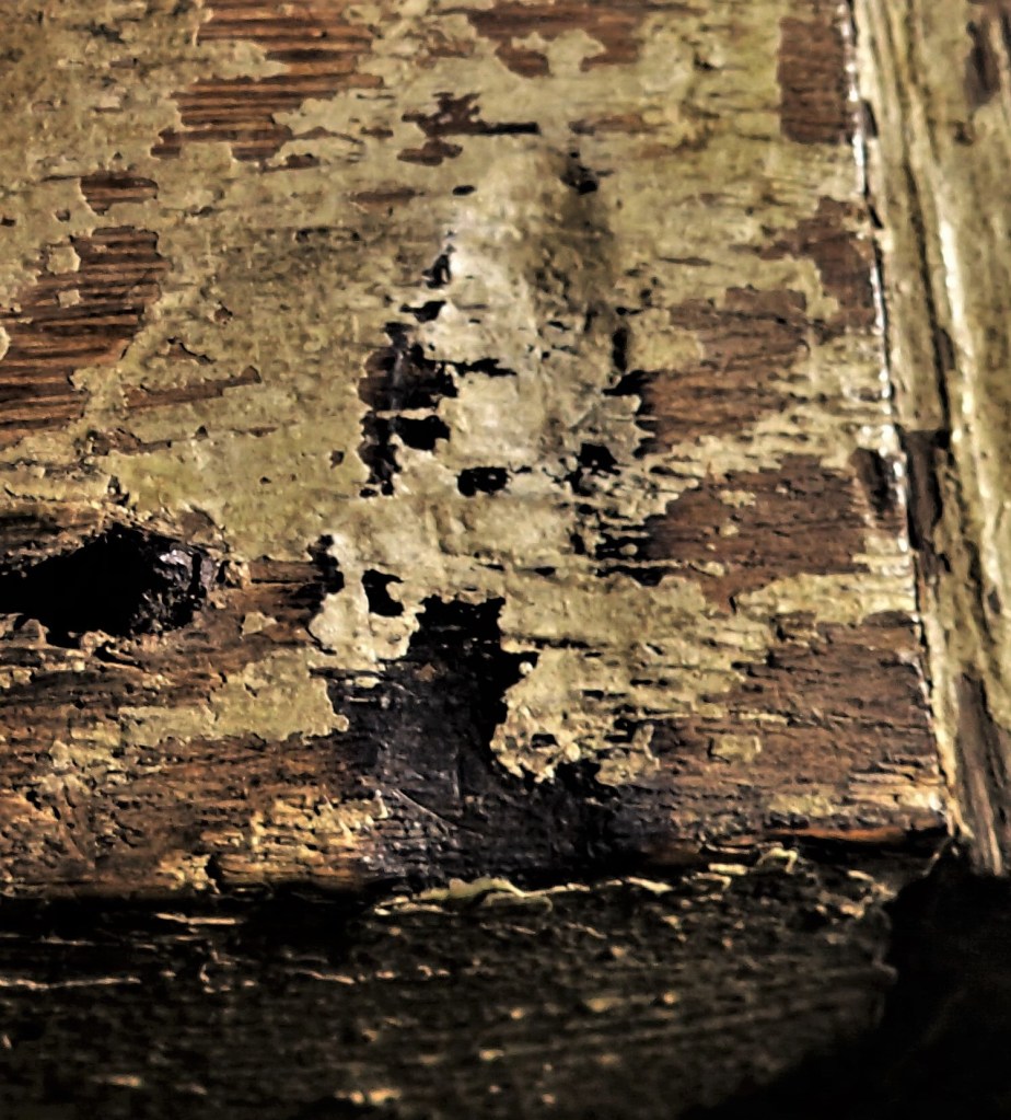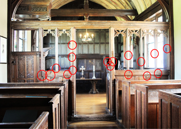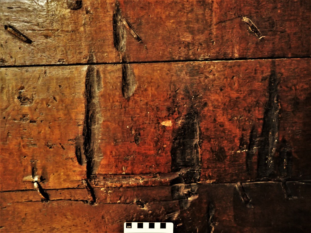 However, the counter-argument for accidental burning persisted, and the phenomenon became the subject of heated debate. Back in the field, archaeological examination of burn marks on timber elements found that, in the majority of cases, ‘where burn marks were found, candle sconces or candle fittings were absent’ (Champion 2017b: 6, Hoggard 2019: 94, Wright 2021). The results from ‘modern’ building surveys culled from the new generation of buildings archaeologists have found burn marks in ever more unusual locations. In churches, they are most often found on the inside of the main door (Champion 2017a), but they have been recorded on Rood Screens, craftsmen’s tools, painted canvases and even on smaller, ‘portable’ objects and furniture (Perkins 2012).