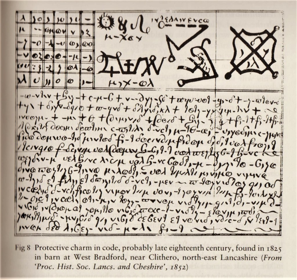 It was clear to Merrifield that the charms had been fabricated by a local cunning man (or wise woman) who had used a combination of symbols including Greek and Latin letters (often learnt and copied out by rote), magical word squares, astrological ciphers and ‘occult’ symbols, written out side-by-side with short Christian tracts and other ‘disparate’ symbols known to be associated with deflecting the evil eye. ‘The charms were an admix of prayer and spells, piety and ritual enchantment, invocations of various deities and corrupted Latin. It was a kind of white magic that lay on the borderland between religion and sorcery’ (Merrifield 149-153). In ‘Candle Powers’ Easton had asserted that the motifs used in the candle writing appeared to reveal a ‘shared knowledge’ of symbols that may have been considered efficacious in offering protection against the cultural anxieties surrounding the potential ills caused by evil spirits or malicious witchcraft.
