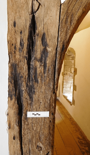 An important development in this regard was the survey of taper burn marks recorded at Donnington-le-Heath Manor by Alison Fearn in 2017, as she was able to tie-in the application of the burn marks to the dendrochronology dates taken from the timber elements. Dendrochronological analysis had been applied systematically within the manor and it was found that the interior woodwork consisted of a mix of 13th and 17th century timbers. The range of dates was accounted for by later structural additions, repairs and renovation. The roof trusses that support the main roof had been dated by dendrochronology to circa AD 1618 whereas the internal door jambs to the arched oak doorways of the upper floor wings are dated to between AD 1272 and 1307 (Fearn 2017:99). During the survey, she recorded a number of taper burn marks that had become distorted as seasoning cracks had subsequently opened up, indicating that the scorching had occurred on green timber either during the conversion process or shortly after completion of the building (Fearn 2017:102,106) Her work provides us with one of the earliest examples of taper burn marks on structural timber and establishes the fact that the practice was already being undertaken in the pre-Reformation era (Fearn 2017:102,106).