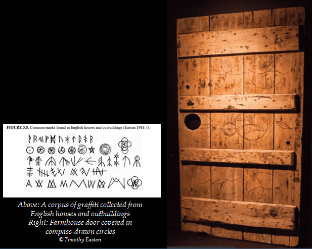 Among the more esoteric symbols he managed to isolate the name ‘Sarah,’ which documentary research identified as being the daughter of the Sugate family who occupied the house in the 17th century. He posited that the marks may have been made as a way of trying to cure her sleepwalking – which was often interpreted as possession in the medieval period. It was seen as a ‘disorder of the body and soul,’ episodes of which were believed to place the body in a ‘dangerous and disordered’ state (Easton 2011: 57, Mac Lehose 2013). The marks may have been the material evidence of a ‘specialist’ (such as a cunning man or woman) having made the marks, which may have been done, perhaps, with suitable incantations or prayer (Easton 2011: 56, Gaskill 2018:134). He believed that the archaeological evidence (and the building’s chronology) pointed to it being highly likely that the marks had been made during the second half of the 17th century (Easton 2011: 56).