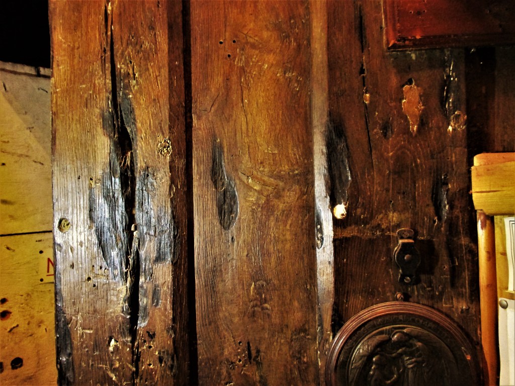 Main image: Multiple deep taper burn marks on the oak door to the nave at St Mary the Virgin & All Saints, Boxley, Kent