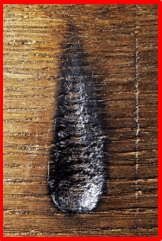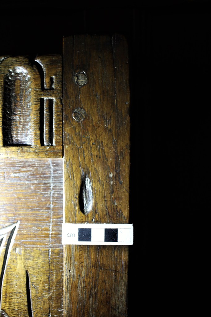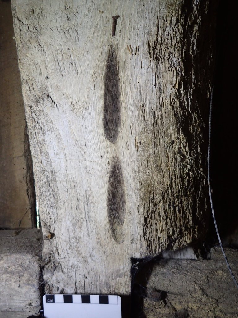 With this in mind, the third method which facilitates dating is the close examination of the burn mark itself; as the green oak dried out seasoning cracks would have opened up along the grain of the wood. If a taper burn is applied to the fresh (green) wood, its shape will become ‘distorted’ over time as the cracks open up – further, there will be no evidence for burning inside the cracks as the mark was made prior to seasoning. Burn marks made over pre-existing cracks will not have been subject to the same kind of distortion and burning will be discerned within the cracks themselves. Even taken together, the above methods will only provide an estimate for when the burn marks were made.