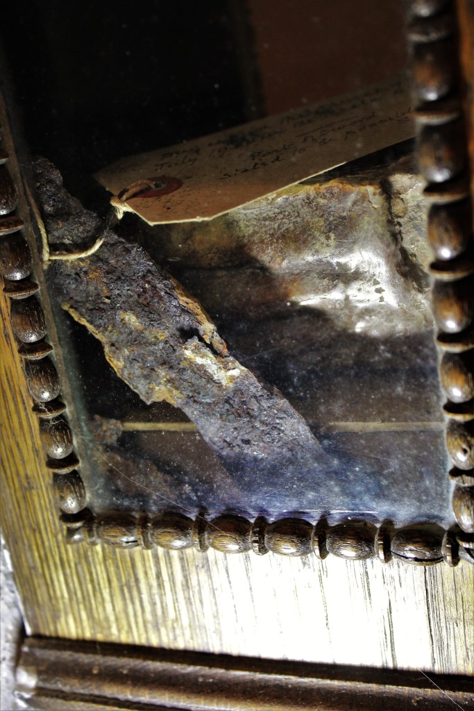 The fragment of sword included in the case is an advanced state of corrosion which attests to its high ferrous content but not necessarily its age. It is unknown as to whether it is really an Anglo-Saxon sword. At the time of deposition that may not have been the point; an objects’ ‘mythical’ provenance was often considered to be more important than its real one when it came to magical talismans. You have to want to believe.