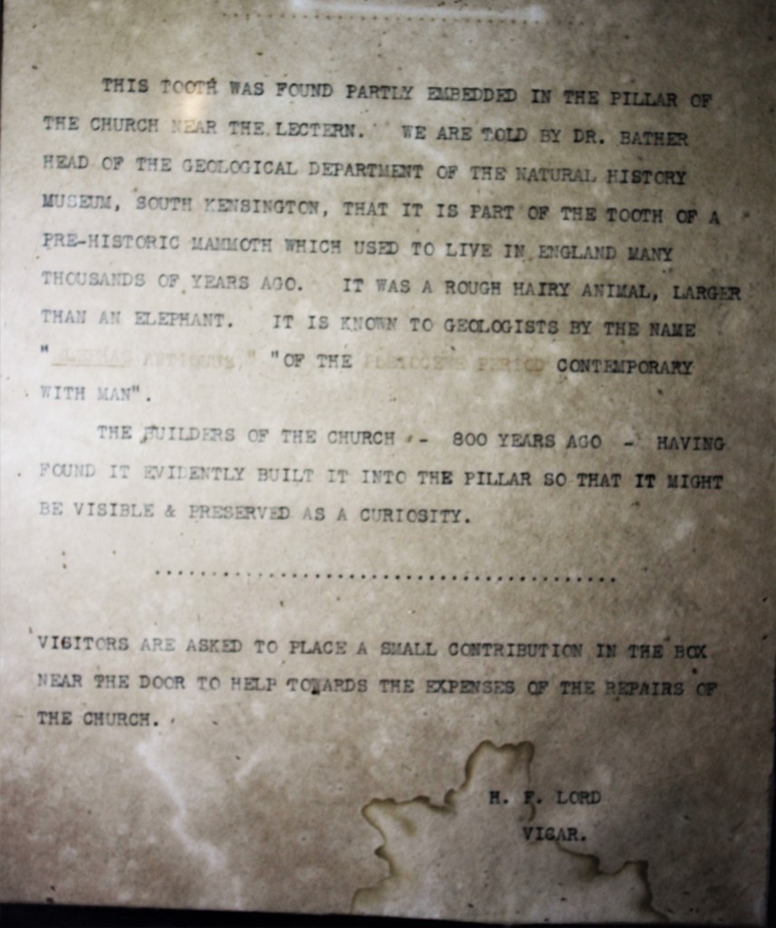 “The molar is an Ice Age Straight Tusked Elephant and not a Mammoth This is May be the only instance of an Ice Age fossil tooth preserved in a UK church. The platelets on the tooth suggest it is a Straight Tusked Elephant rather than Mammoth. You might want to contact the Natural History Museum with news of this. Antony Sutcliffe’s book “On the Track of Ice Age Mammals “published by the Natural History Museum in 1985 has a chapter describing Ice Age fossil finds in historic times and what people then thought they were. Also records their use as ingredients for medicines. It would be interesting to know how the elephant tooth found its way into the church.”