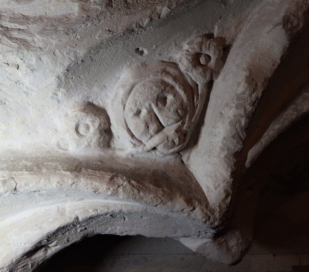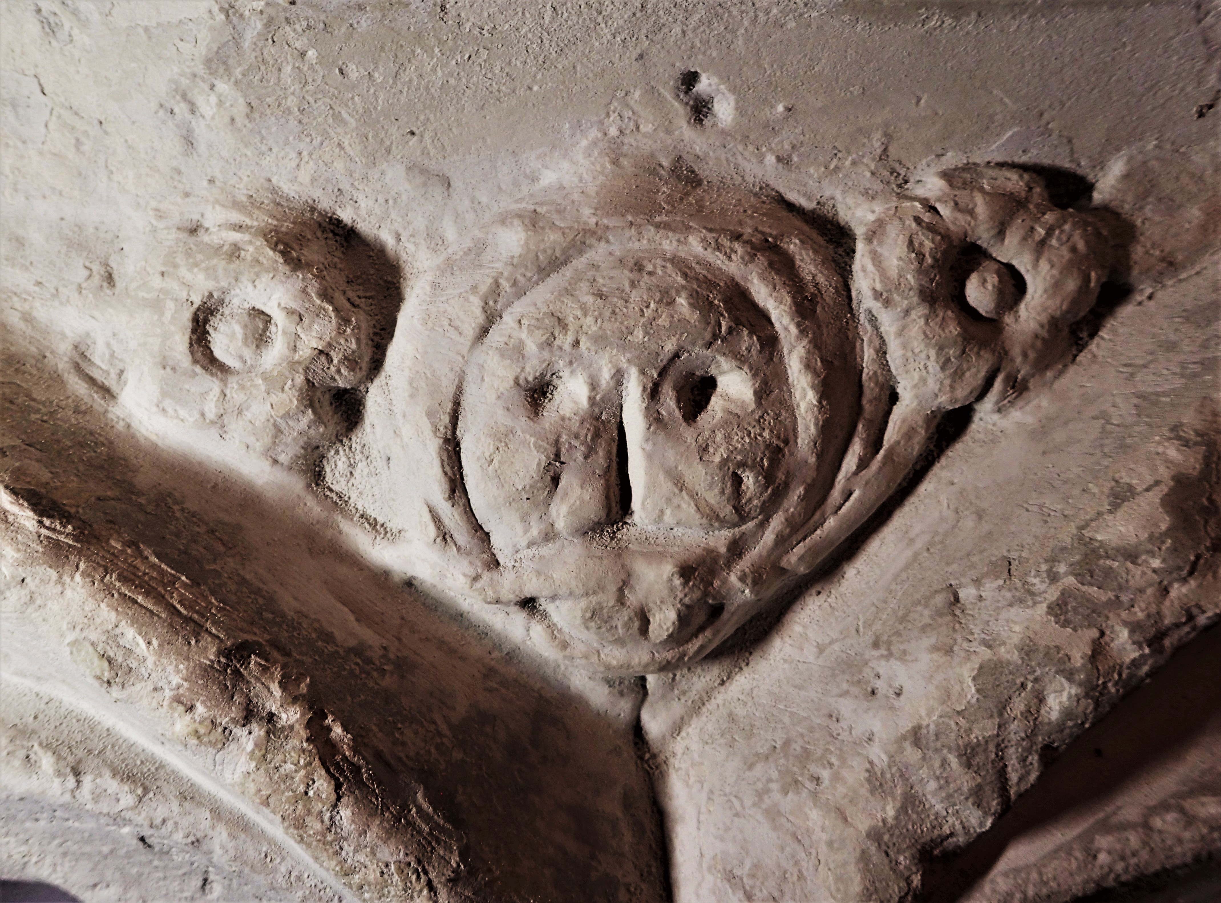 This wee fella is cut into the spandrel of the 14th century arcading in the Nave. The arcade is made from the soft stone known as clunch and he is slightly obscured by the later, clumsily-daubed whitewash. His nose has been slit by a pointed metal blade and left eye gouged!