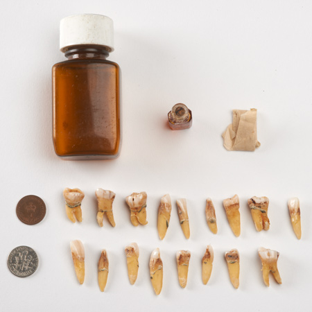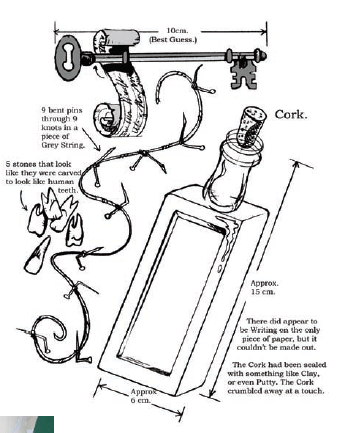 The bottle was found on the foreshore of the Thames, containing slivers of metal, coins (the latest of which dates from 1982), a tiny bottle of oil of cloves- and a large number of human adult teeth. Whoever placed this into the river clearly believed in the power of ritual magic as oil of cloves is often used to treat toothache. It was concluded that the witch-bottler may have been pleading- or giving thanks for- relief from tooth pain.