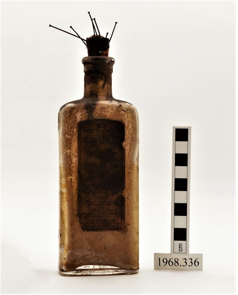A late 19th century glass witch bottle was located in the subfloor, (adjacent to path to front door) of a timber cottage. It was wrapped in rag and contained a dead mouse, nine bent pins attached to a piece of string with nine knots, “teeth” made from stone and a piece of paper with illegible writing coiled around a key. The bottle was found around 2000. This object may have been a modern recreation of a traditional witch bottle.