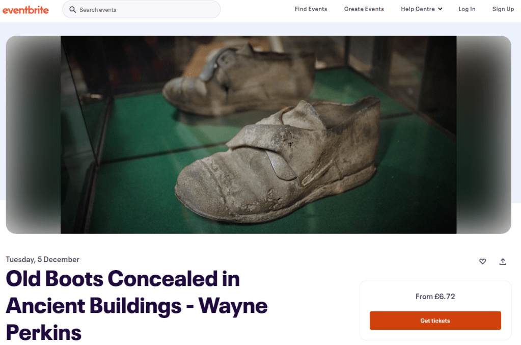 Concealed shoes have been found in building contexts – both religious and secular – from all over the English-speaking world and are widespread across Europe (Cameron 1998:2, WDOAM 2007:33, Hoggard 2017: 8). They were by far the commonest charm used to protect buildings in post-medieval times (Merrifield 1987: 131).