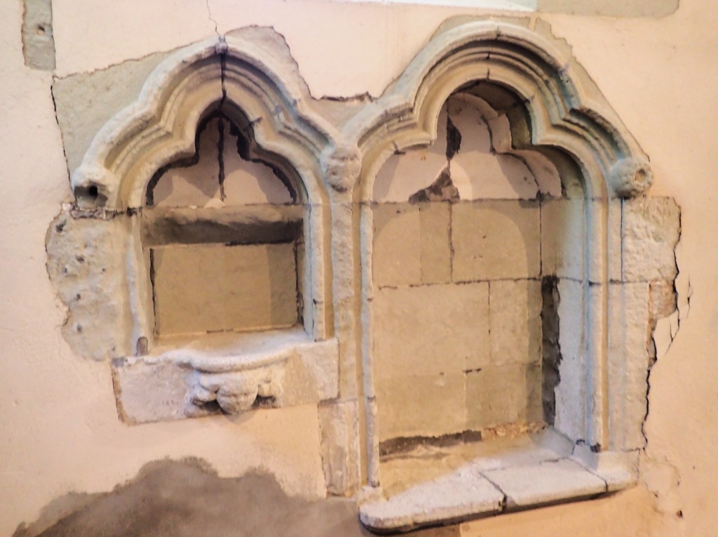 Plate 3: 13th century sedilia and piscina with shelf. Saint Mary the Virgin, Chalk, Kent.