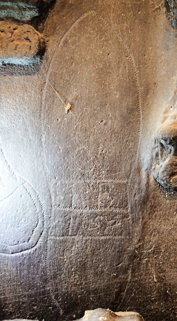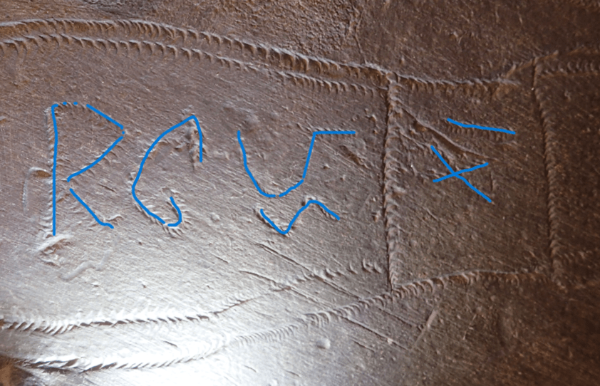 However, the two shoe outlines are of two different   shoe types – one squared and one pointed shoe suggesting more than one person present. The dedications are also hard to read-I have tried to over-write them but they are incomplete and, like so much graffiti, a difficult to decipher. The pointed shoe seems to read, ‘R B 1758,’ the squared toe shoe appears to read, ‘RC…SG…XI / 8I (?) (Plates 9, 10). If I have read the date correctly, the making of the outlines would have occurred some time after the commemoration date on the second lead plaque. This plaque also has a small amount of graffiti including the letter ‘T’ cut below the initials W.N.