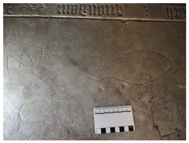 On the wall of the north aisle are two lead plates or plaques, bearing bas-relief figures and decorative flourishes. On closer inspection – and with the use of a raking light applied at 45o – two shoe-outlines were revealed which had been cut into the soft lead (Bull 2023, Vigar 2023) (plates 7, 8). It transpires that both lead plates had been removed from the tower roof in 1935 (Bull 2023) Local historian Christophe Bull recounts the local folklore that, ‘the footprints are believed to be those of William Brown of East Court Farm, a major mid-18th century landowner’ (Bull 2023). This is a believable premise, as often patrons of the church would be associated with the work and maintenance carried out on the building. This type of graffiti can therefore come under the category of ‘commemoration’ graffiti. The shoe outlines are considered to be the  ‘signatures’ of the workers (or plombiers) which are then ‘confirmed’ by the addition of the vicar’s shoe outlines along with those of the verger and anyone else involved (Easton 2013:41).