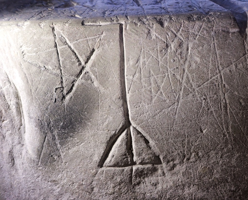Unusually, at St James’ church in Granborough, Bucks, the graffiti is almost completely confined to the chancel rather than the Nave (the public domain). From this background palimpsest of lighter marks is a deeply cut depiction of the gallows alongside a pentangle; both bear the residue of lime-wash that had once been applied to the walls, suggesting that they are examples of pre-Reformation graffiti. Both had been made by deep, strident incisions but it is impossible to say whether they were made at the same time or if they were meant to be symbolically linked.