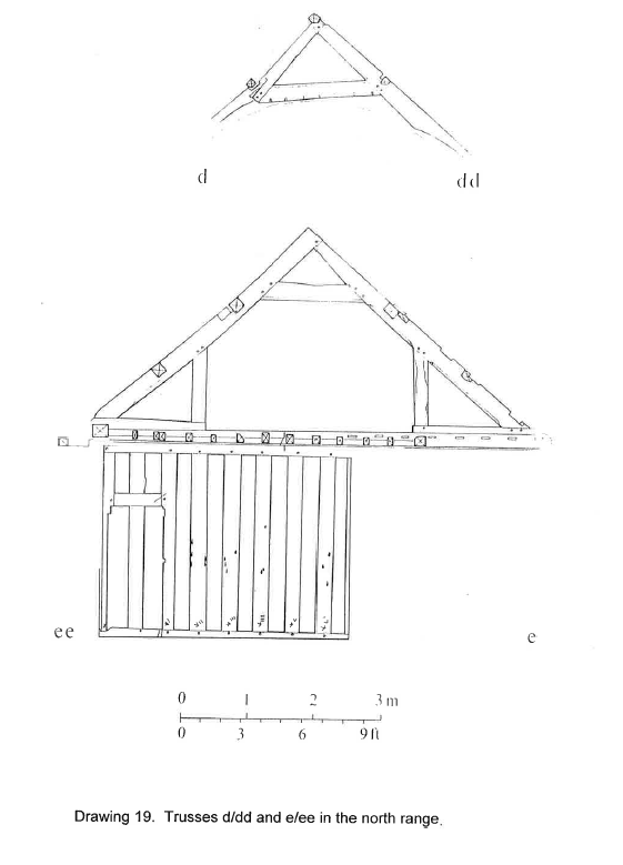 Detail of the truss drawings from the north range, the burn marks have been carefully drawn by Meeson’s team with the Roman numerals of the carpenters at the base of the studs (Meeson et al 2002).