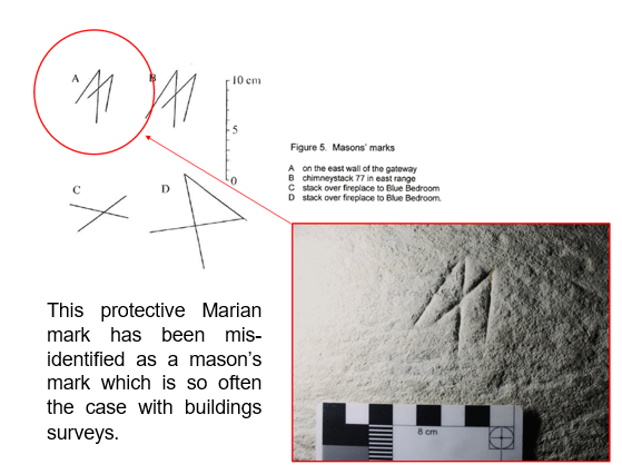 It is possible that, in the past, a mason may have ‘adopted’ a Marian mark as his professional mark. However, here at Baddesley we have all the usual issues when it comes to identifying ‘true’ mason’s marks. The problem, as ever, is the inconsistency of the markings on the masonry blocks. To make a real case for them being a mason’s mark requires a series of caveats to explain their absence elsewhere. Only a tiny proportion of the stones have a mark; it has been suggested in the past that the ‘missing’ marks are explained as having been weathered out; or perhaps the marks had been made on the reverse of the stone; or that the stones themselves had been ‘turned’ for some reason..etc etc. These explanations are not justification for calling one of the motifs a ‘mason’s mark’ when placed alongside the other evidence.