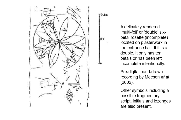 - An unusual, motif composed of ‘radiating’ lines in a ‘star’ pattern, located below a signature cut into the plaster (Moat Room)