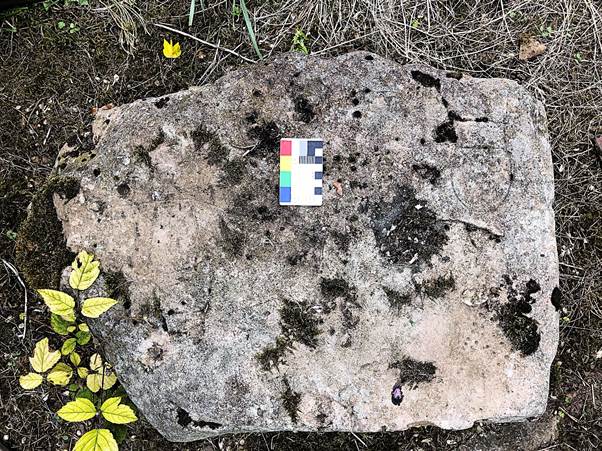 Plates 11 & 12 : Unusually, on the same headstone, two dedications, one on either side showing that it had been re-used even after it had been scavenged from the Abbey. Photo: © W Perkins 2024