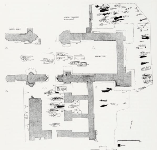 Plate 22: Pattern of burials at Bordesley Abbey at east end of chancel. Not only are there burials within the chancel and side chapels but observe how burials outside the building cluster around the east end. Excavation plan © Rhatz, Hirst & Wright 1983.