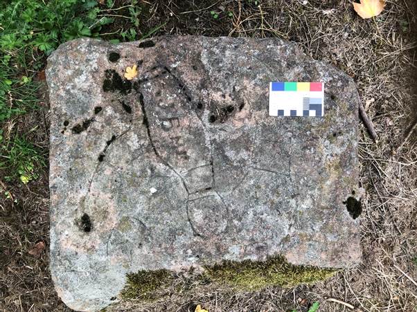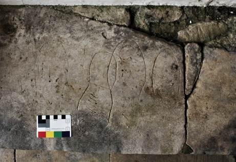 Outlines of feet are rare, as it is in nearly all cases the shoe which has been outlined, not the human foot. Early interpretations for the phenomenon of shoe outlines were that they had been made by pilgrims visiting relics or shrines. This idea was debunked long ago, based upon the style of shoe and the fact that many carry initials and dates which are – for the most part – post-Reformation. Sometimes, the depiction of the soles of the shoes can show the division between sole and heel, as well as hobnail patterns, some with the addition of apotropaic designs (Davidson 2017: 75).