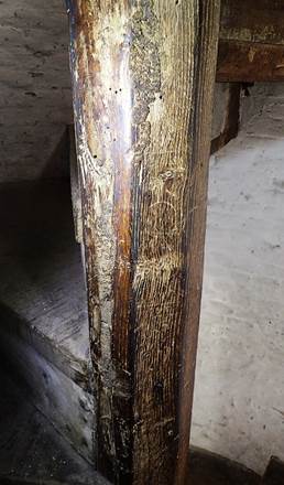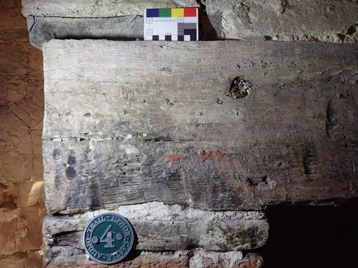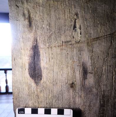 Ritual taper burn marks on the bressummer/lintel above the entrance fireplace, Gatehouse. View to the south-west. Photo: © W Perkins 2024.