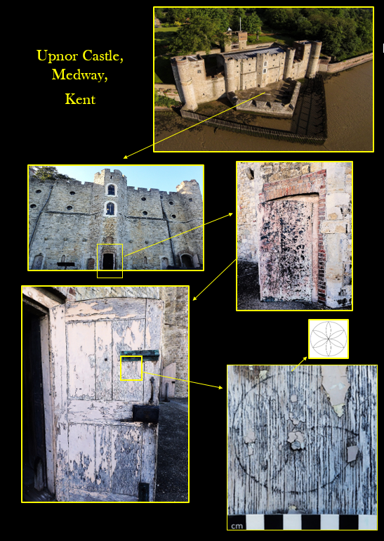One of the most unusual discoveries that I have made recently is a six-petal rosette (or daisy wheel) graffito that had been incised into the rear of a blast door at the former gun battery of Upnor Castle, Kent. It had been cut into the wood and then hidden under a thick coat of paint – until now.