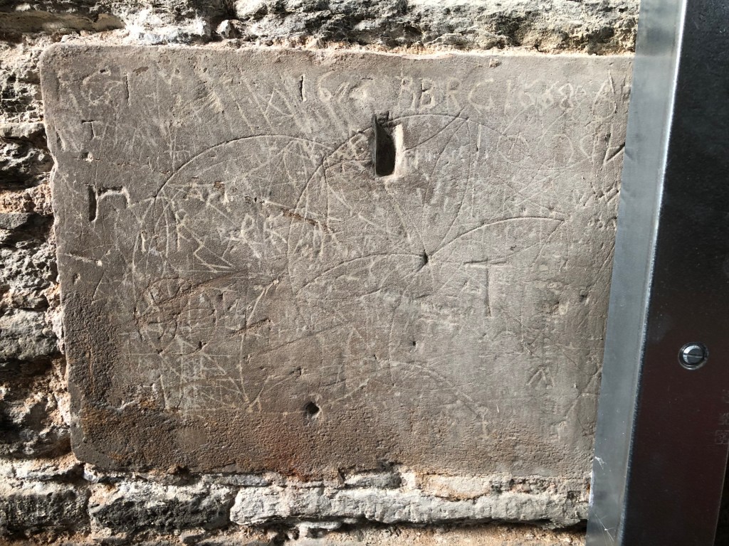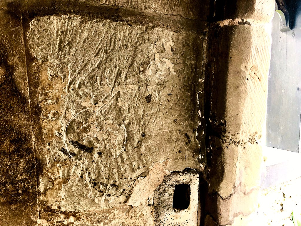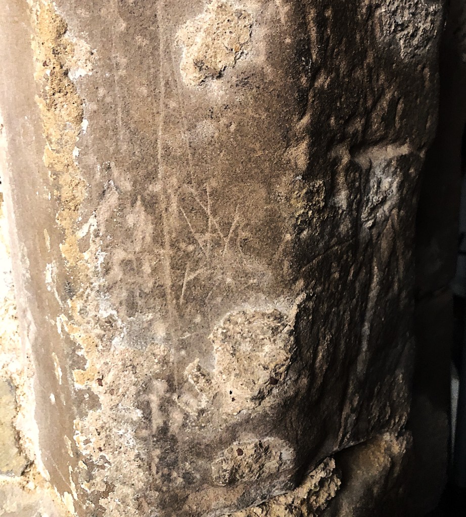 In the church, the graffiti was sparsely distributed but there was a notable concentration under the tower crossing. Perhaps the most significant was the sandstone block cut with multiple overlapping daisy wheels (properly called six-petal rosettes). In general, six-petal rosettes are seen as devotional motifs which may have provided a focus for prayer much in the way that a prayer wheel does, allowing one to channel one’s devotions. Additionally, the six-petal rosette is considered to provide a protective function as an apotropaic but in its deployment its functionality would not have been regarded as mutually exclusive (Perkins 2022).
